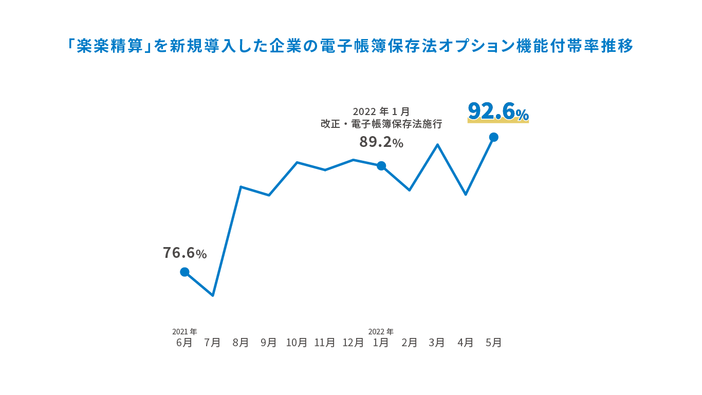 ラクスが展開する、「楽楽精算」でも電子帳簿保存法に則した領収書・請求書のスキャナ保存と電子取引データの保存に対応する機能をオプションとして提供しています。以下のグラフは、「楽楽精算」を新規導入していただいた企業の電子帳簿保存法オプションの付帯率推移です。2021年8月頃から伸長しており、2022年5月実績では92.6%の付帯率となりました。電子帳簿保存法への企業の対応が加速している結果となっております。