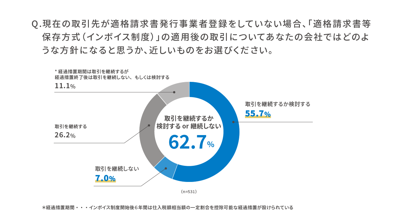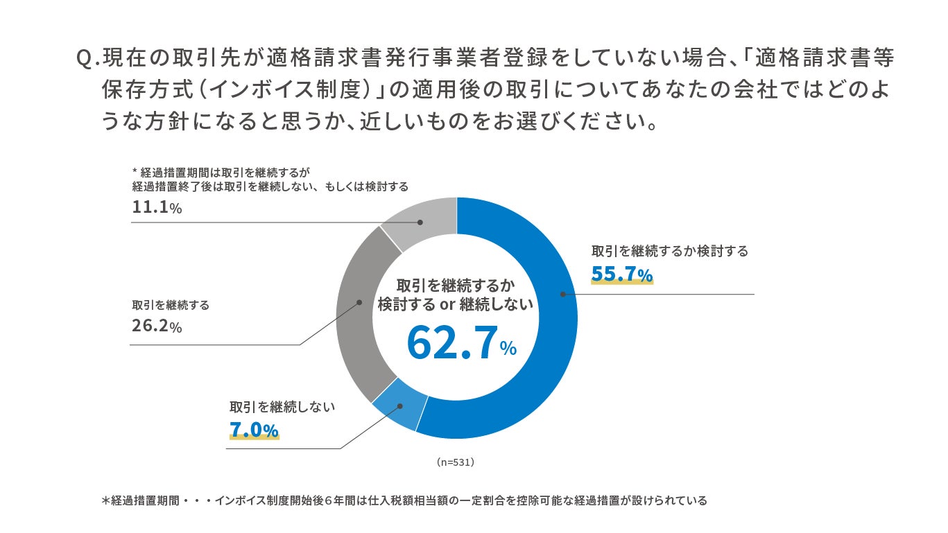 - 適格請求書発行事業者ではない場合、6割以上が「取引を継続しない」または「継続するか検討する」と回答