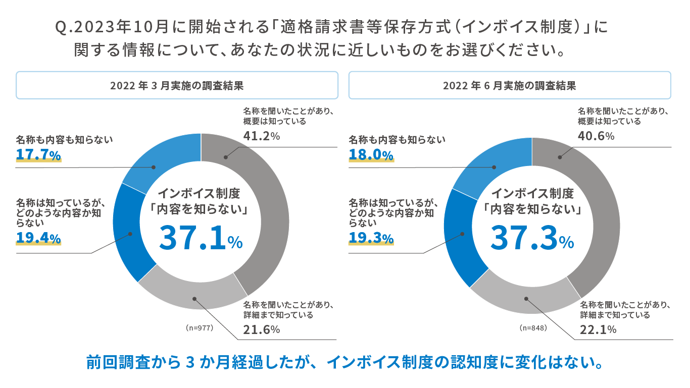 - 「インボイス制度を知らない」と回答したのは約4割。2022年3月の同調査から変化無し