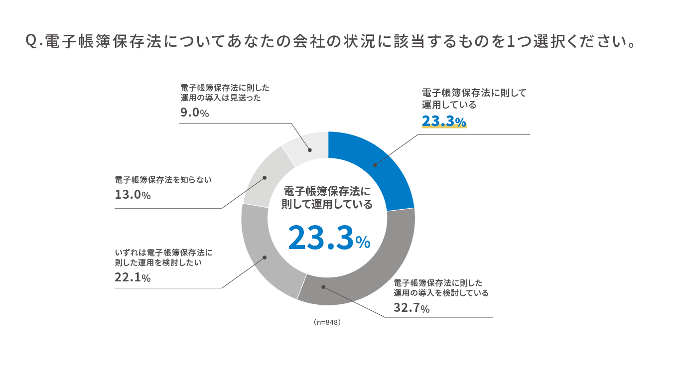 「電子帳簿保存法に則して運用している」と回答した企業は23.3%となり、残りの76.7%の企業が運用できていない事が明らかになりました。