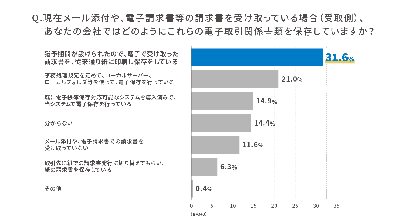 電子取引関係書類の保存方法に対しては、「猶予期間がもうけられたので、電子で受け取った請求書を、従来通り紙に印刷し保存している」と回答した企業の割合が31.6%となり、対応が先送りになっている様子が伺えます。また、「取引先に紙での請求書発行に切り替えてもらい、紙の請求書を保存している」と6.3%の企業が回答。電子帳簿保存法への理解浸透にも課題がある様子が伺えます。