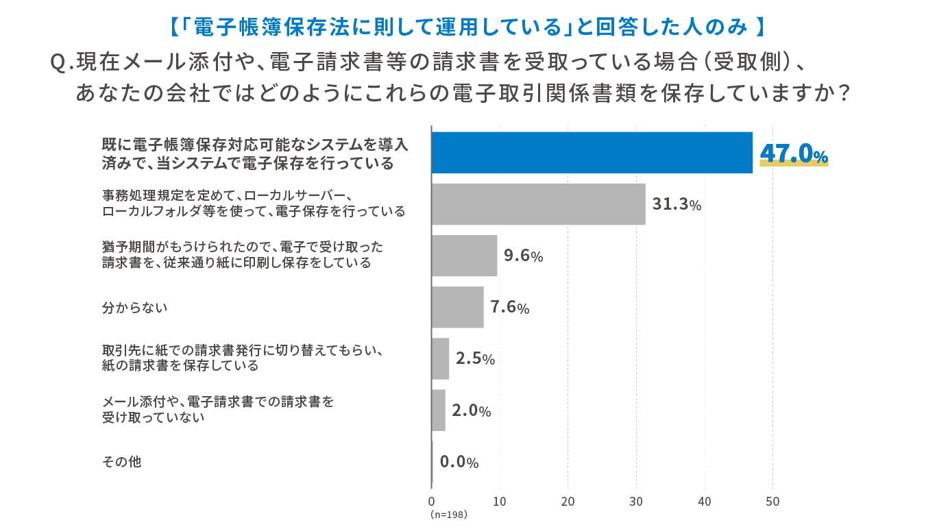 今回の調査結果ではインボイス制度、電子帳簿保存法ともに対応が遅れている状況が分かりました。では、既に施行されている電子帳簿保存法に対して、「電子帳簿保存法に則して運用している」と回答した企業はどのように対応しているのでしょうか。結果は、「既に電子帳簿保存対応可能なシステムを導入済みで、当システムで電子保存を行っている」と47.0%の企業が回答し、システムを導入し対応を行っている企業が多いことが分かりました。