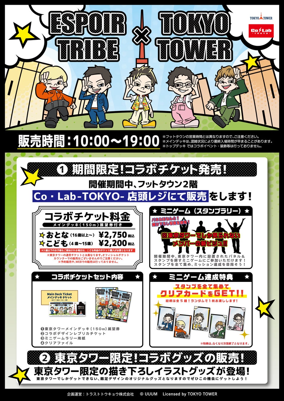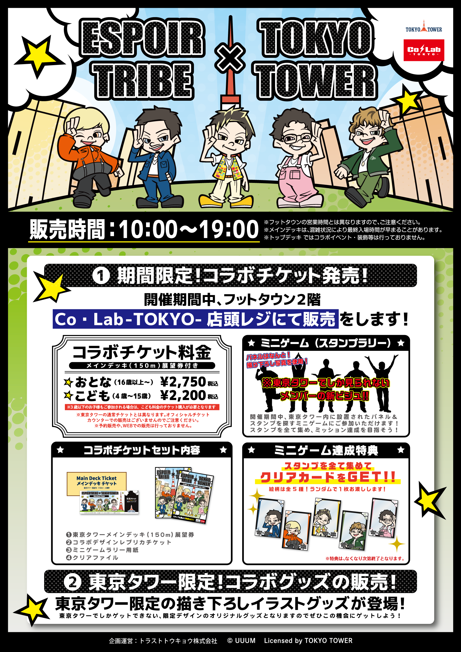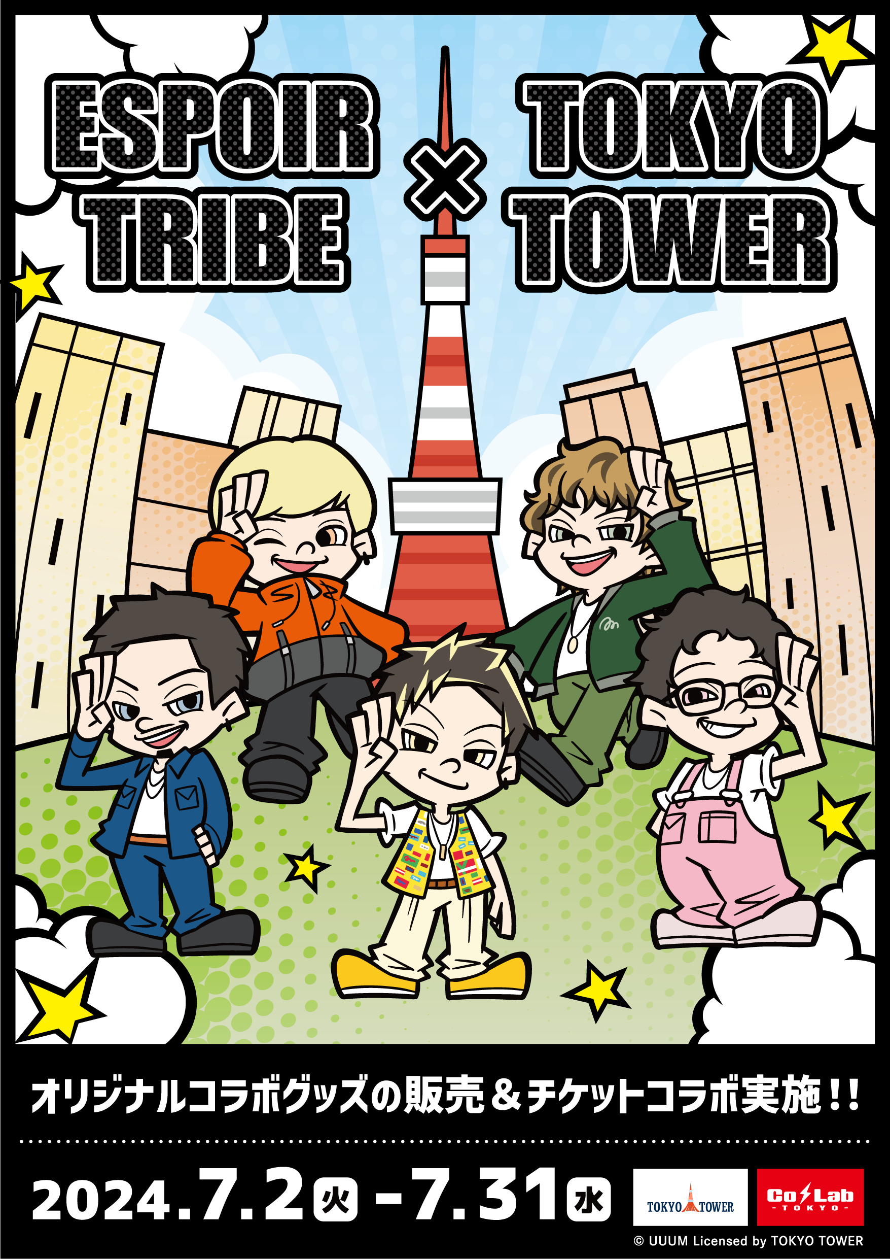 トラストトウキョウ株式会社(本社:東京都渋谷区)が運営する東京タワー内「Co・Lab-TOKYO-」にて、UUUM株式会社(本社:東京都港区)所属の「ESPOIR TRIBE-エスポワール・トライブ-」(以下、ESPOIR TRIBE)と東京タワーのコラボイベント『ESPOIR TRIBE × TOKYO TOWER』を開催いたします。東京タワー内を巡るスタンプラリーや「Co・Lab -TOKYO-」での限定コラボチケット&限定コラボグッズ販売されます。