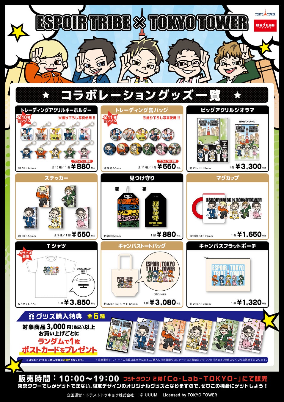 東京タワーフットタウン2階「Co・Lab-TOKYO-」では、『ESPOIR TRIBE × TOKYO TOWER』の為に描き下ろした新イラストと撮り下ろし新ビジュアルを使用した限定コラボグッズが販売決定!!(全9アイテム32種類)