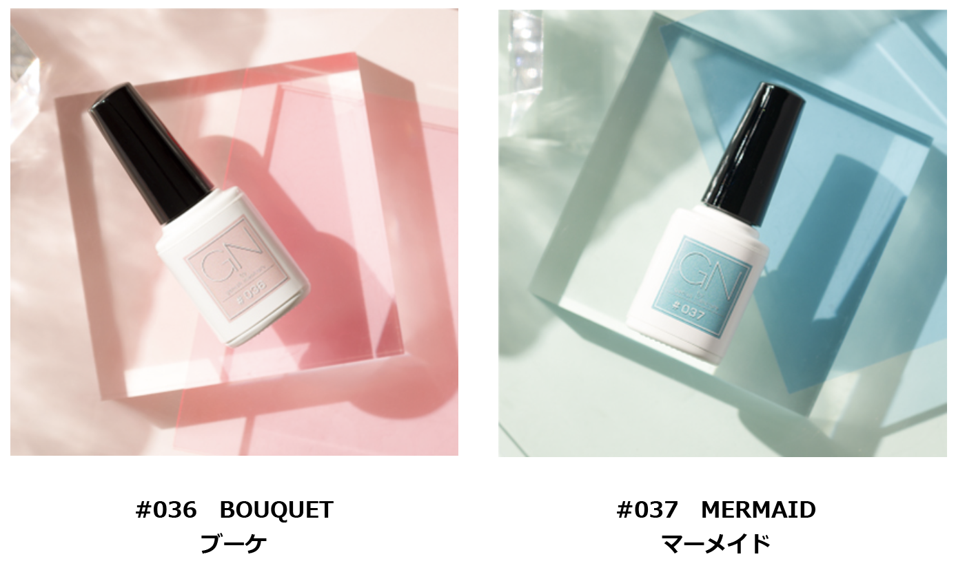 この春新発売する2 色は、ゴールドパールがほのかに輝くフローラルピンク「#036 ブーケ」、華やかなラメがきらめくエメラルドグリーン「#037 マーメイド」。