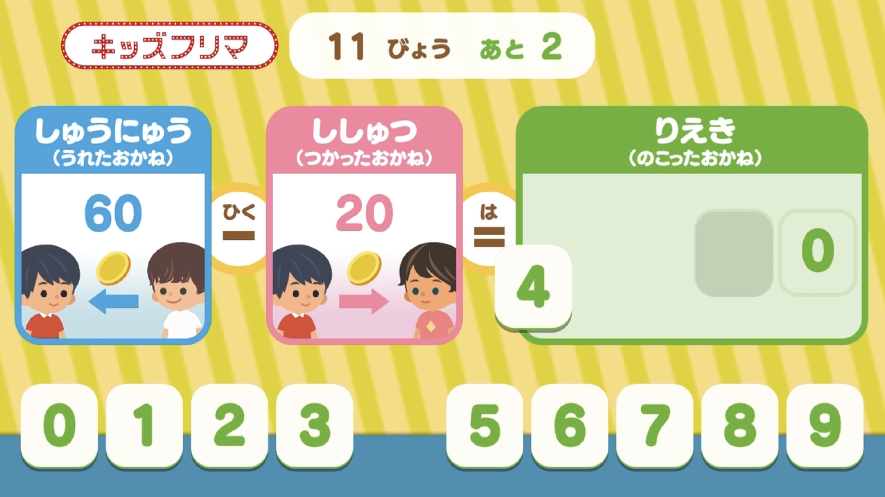 利益(残ったお金)を計算して正しい数字をパネルに移動しよう。