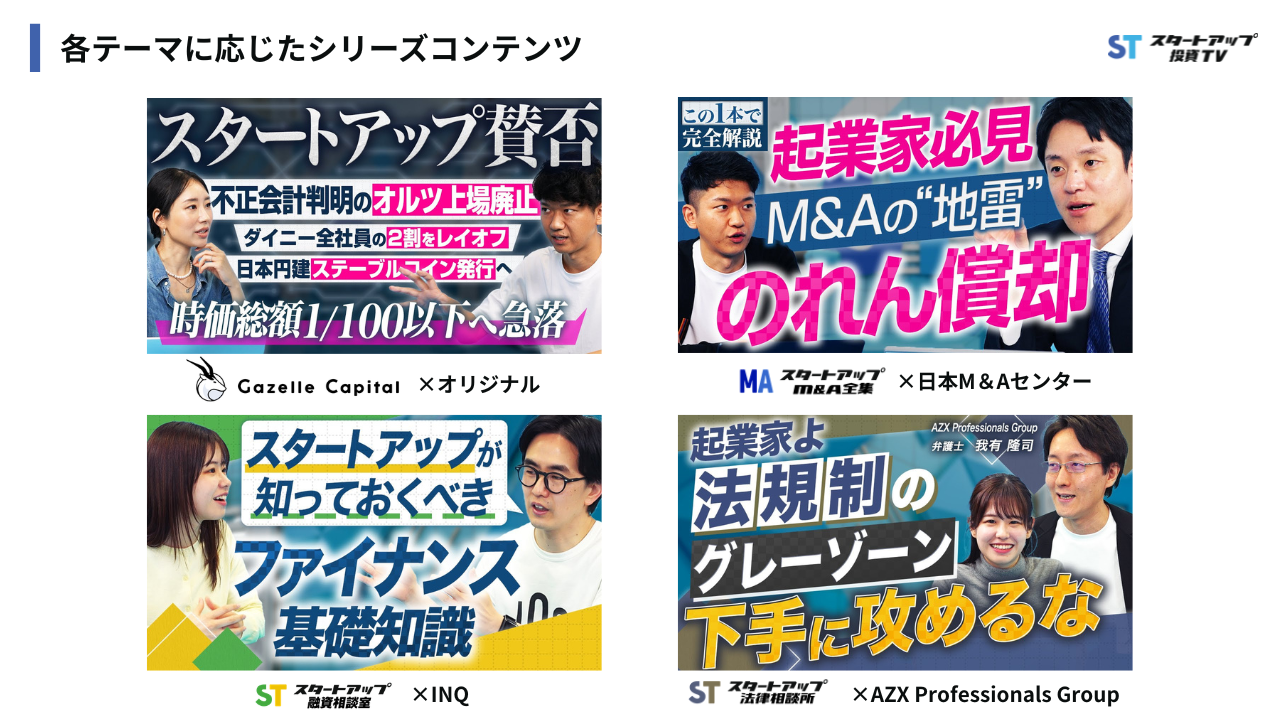 今後はスタジオ収録を超えて、日本全国のスタートアップのいまをお伝えするような動画企画や投資ピッチなど、さらなるコンテンツ展開を推し進めていく予定です。
