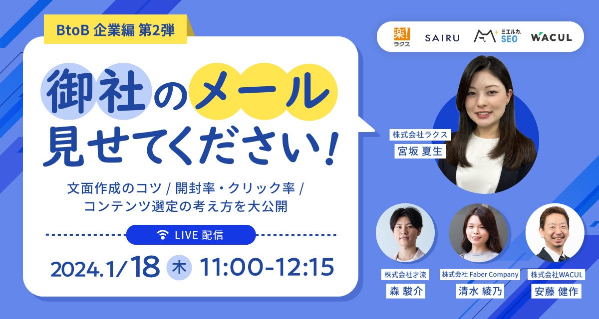 株式会社ラクス(本社:東京都渋谷区、代表取締役:中村 崇則)が提供するメールマーケティングサービス「配配メール」は、2024年1月18日(木)11時より、メール施策にお悩みの法人営業・マーケティングご担当者様向けオンラインセミナー「御社のメール見せてください!! BtoB企業編 第2弾」を開催いたします。