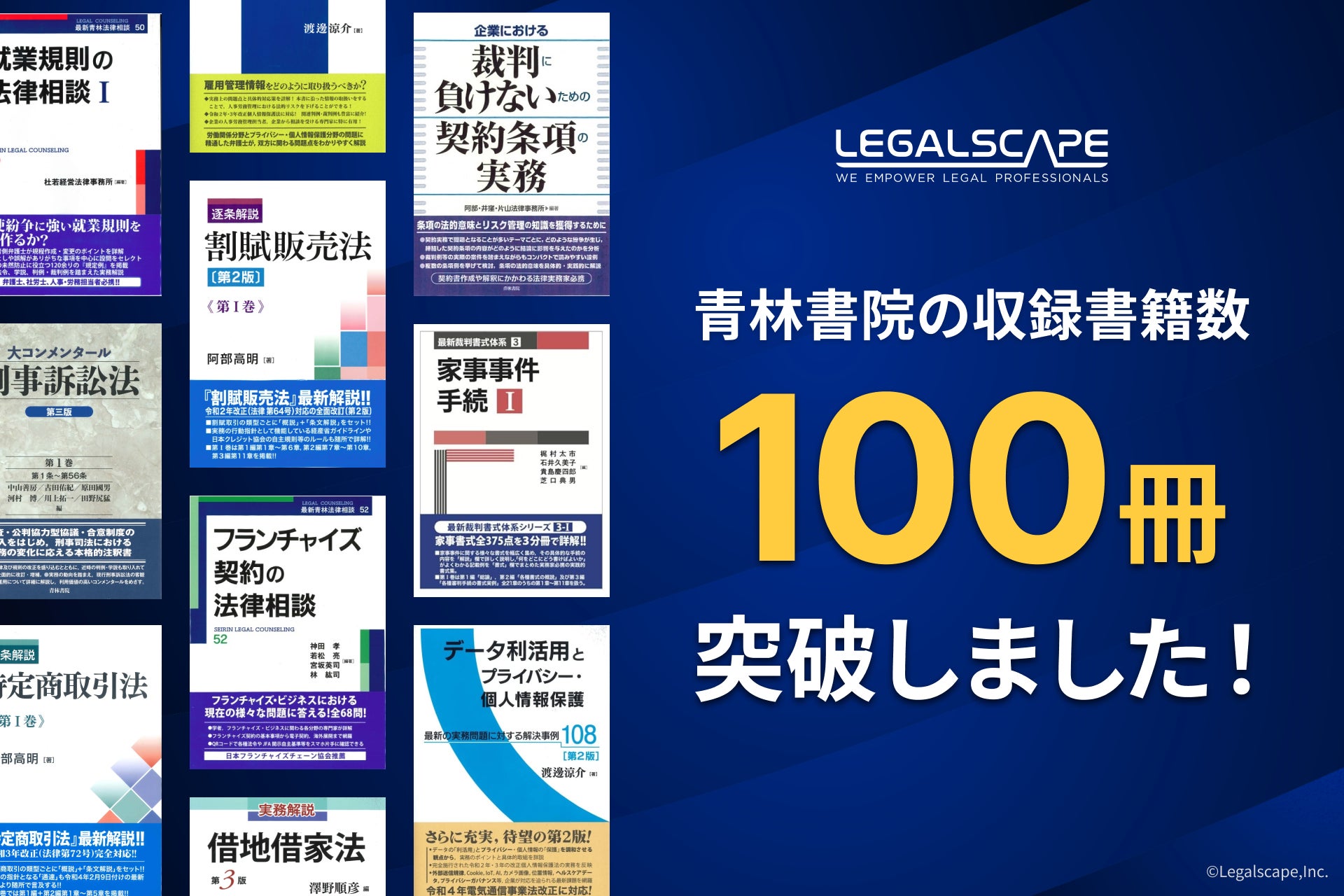 株式会社Legalscape(本社:東京都文京区、代表取締役社長・最高経営責任者:八木田 樹、以下リーガルスケープ)は、株式会社青林書院(本社:東京都文京区、代表者:逸見 慎一)の収録書籍数が100冊を突破したことをお知らせします。