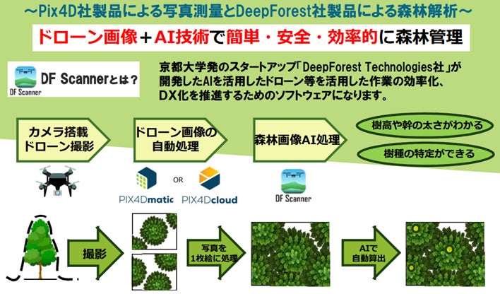 当社は、日本の林業事業でドローン等を活用した作業の効率化・DX化を推進するためのソフトウェアとして、京都大学発のスタートアップ「DeepForest Technologies社」(本社:京都府京都市 代表:大西 信徳、以下「DeepForest社」)が開発したAIを活用したソフトウェア「DF Scanner」及び森林解析用レーザードローン用点群処理ソフトウェア「DF LAT」の国内代理店として取り扱いをしております。これらのソフトウェアは、従来の森林計測では作業者が手作業で行っていた作業工程を、ドローンで撮影したデータを画像処理とAIを活用することで、森林内部に入ることなく安全に調査を行うことができ、なおかつ作業の効率化も図れるといった特徴があります。また、以下の分野への応用も期待ができます。