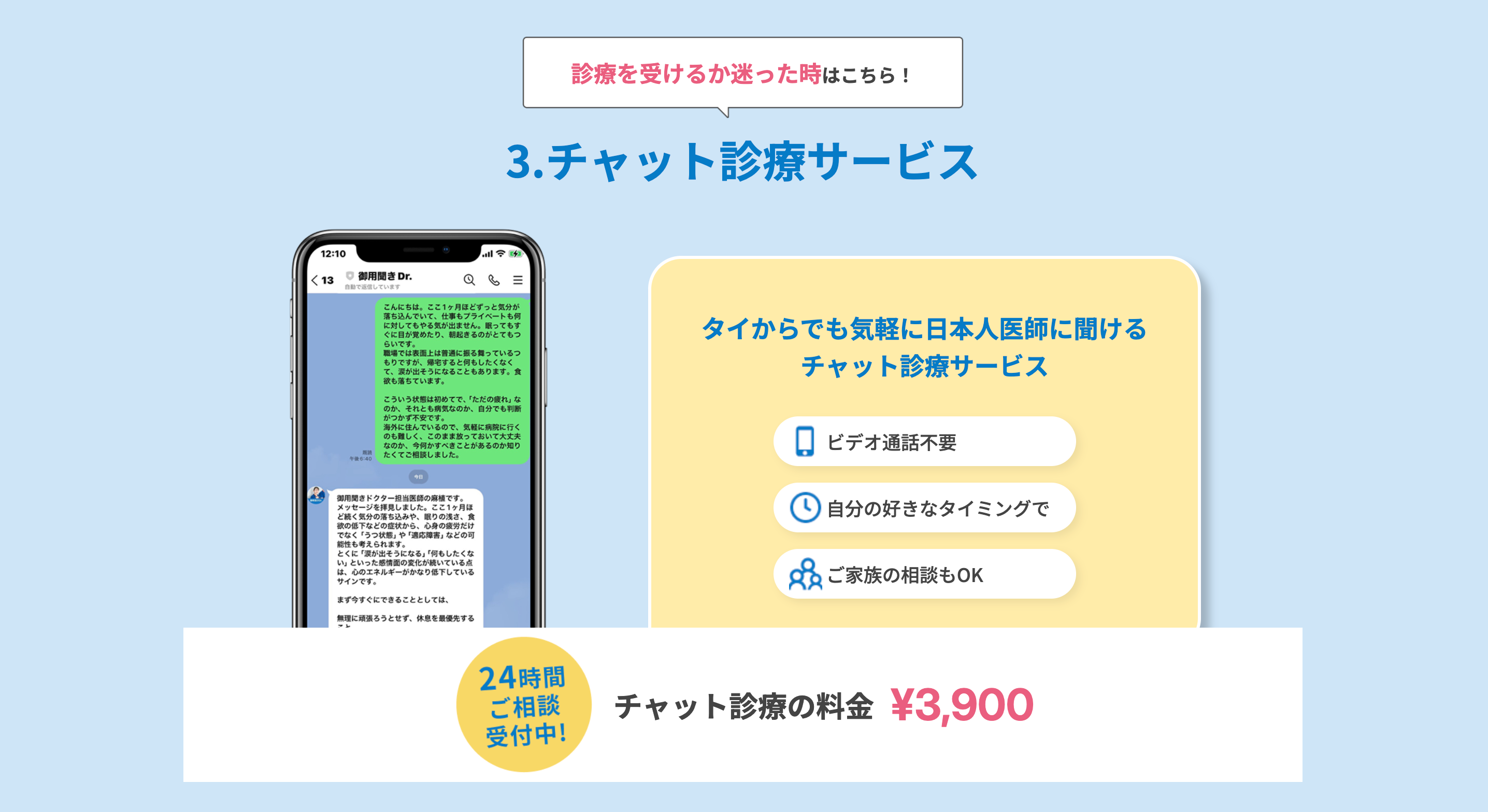 バンコクで体調を崩して現地の病院に行くか迷っていた際に、まずチャットで相談しました。症状の伝え方や聞くべきことを丁寧に教えてもらえたので、言葉の不安なく安心して受診できました。(バンコク在住/駐在員)