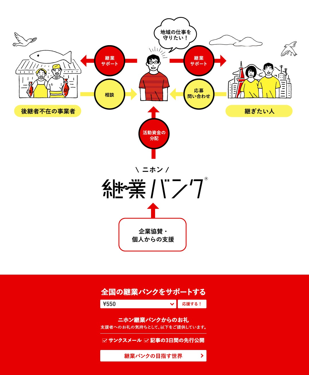 継業サポーターを支援するドネイション制度を新設しました。任意の金額をドネイションすることで、継業サポーターの活動を支援することができます。ご支援をいただい方には、お礼としてニホン継業バンクの記事を3日間先行公開します。地域の継業・事業承継支援にご賛同いただける企業様からのご支援・協賛も募集しています。