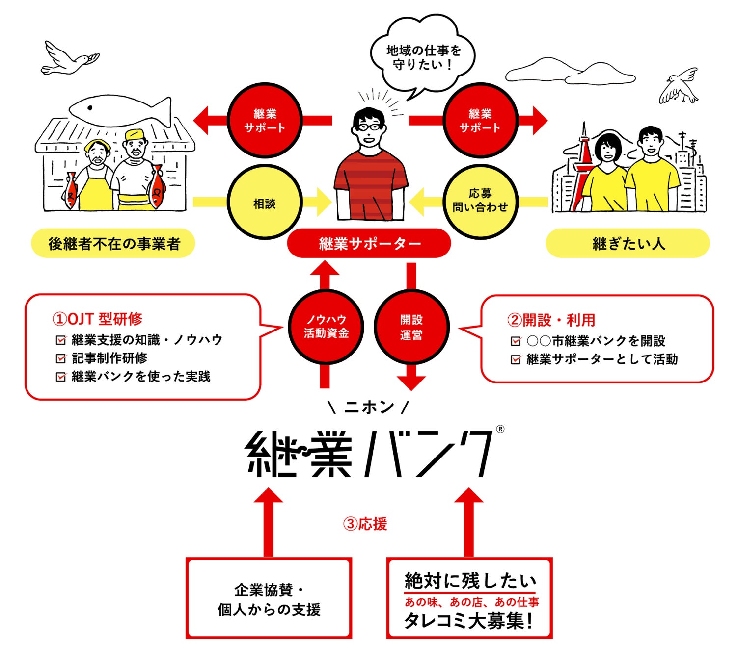 ニホン継業バンクは、地方創生の根幹を支える地域産業の後継者課題を地域の課題と捉え、自治体による「公助」の継業・事業承継支援の仕組みづくりに取り組んできました。今回、この「公助型」の継業・事業承継支援に加え、「共助型」の継業・事業承継支援の仕組みをつくることで、地域で愛される仕事が、後継者がいないことで、惜しまれながら廃業することがないように、様々な立場の人と協力して、地域産業を承継できる世界をつくります。