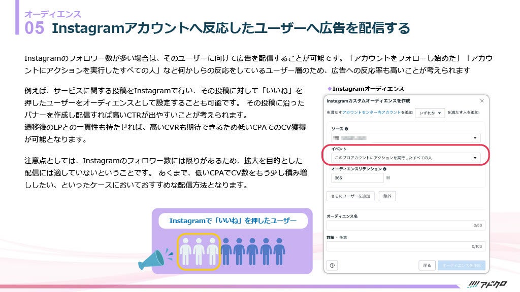 Instagramアカウントへ反応したユーザーへ広告を配信する