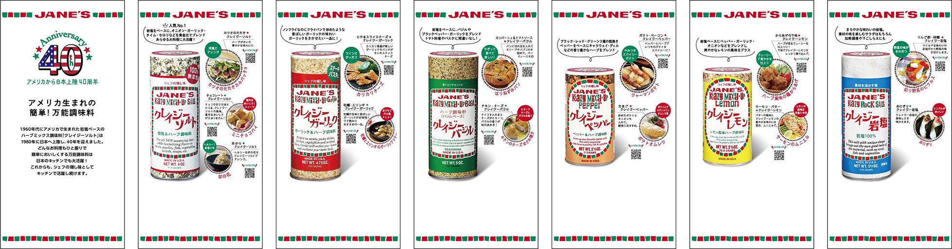 クレイジーソルトの歴史と6種のラインナップパネル展示 1960年代にアメリカで生まれ、1980年に日本に上陸したクレイジーソルト。ブランド名のジェーンおばさんから生まれた誕生秘話や、現在6種類のフレーバーが揃いバラエティー豊かなクレイジーソルトシリーズそれぞれの魅力やおすすめレシピを、パネルでご紹介いたします。