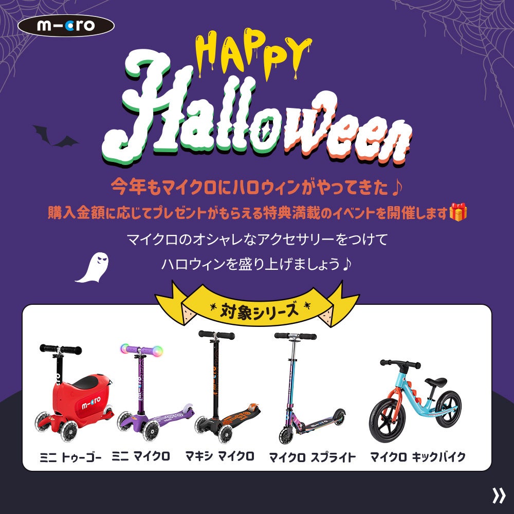 マイクロスクータージャパンは現在、関東2ヵ所で直営店を運営しており、常時キックボード体験及び購入が可能です。現在、直営店では10月14日〜10月31日までハロウィンイベントとしてキックボード購入時に謝恩品をプレゼントするイベントを実施中です。