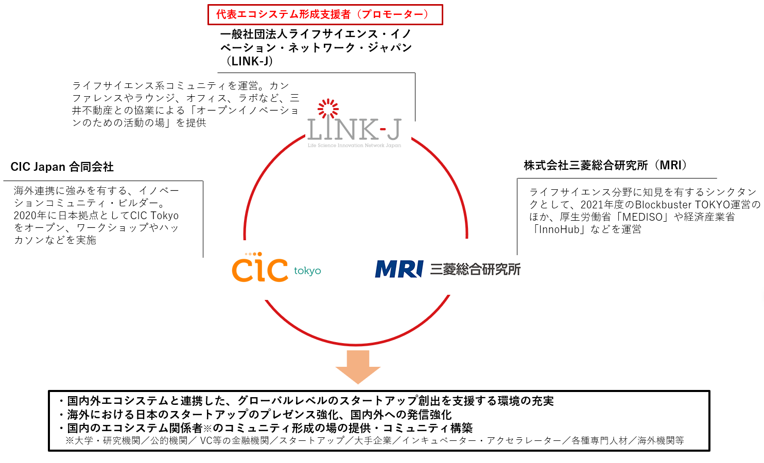 一般社団法人ライフサイエンス・イノベーション・ネットワーク・ジャパン(本社:東京都中央区日本橋室町、理事長:岡野栄之、以下「LINK-J」)、CIC Japan合同会社(本社:東京都港区虎ノ門、職務執行者: Timothy Rowe、以下「CIC Tokyo」)、株式会社三菱総合研究所(本社:東京都千代田区、代表取締役社長:籔田健二、以下「MRI」)の3社はこの度、東京都が実施する創薬・医療系スタートアップ育成支援事業「Blockbuster TOKYO」のエコシステム形成支援者(プロモーター)に採択されました。東京都との協定期間(最大3か年度 )を通して、グローバルレベルのスタートアップ創出のための支援環境を整備するとともに、コミュニティを活性化・拡大し、自走するエコシステムを東京に定着させます。