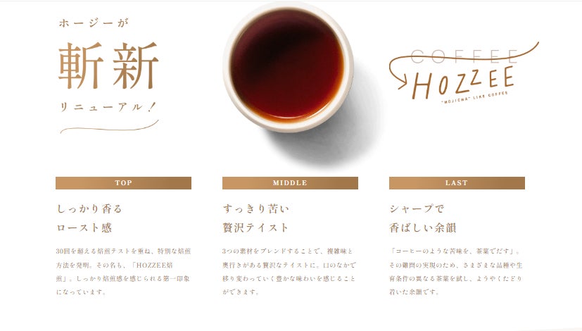 今回のリニューアルでは、より新しさを目指し、「エメラルドマウンテン」「香るブラック」などのブランド商品開発を歴任してきたコーヒーのプロフェッショナル・立花慶久氏が全面監修。淹れたてのTOPからMIDDLE・LASTまで楽しめる、より焙煎感を感じられるほうじ茶が誕生しました。
