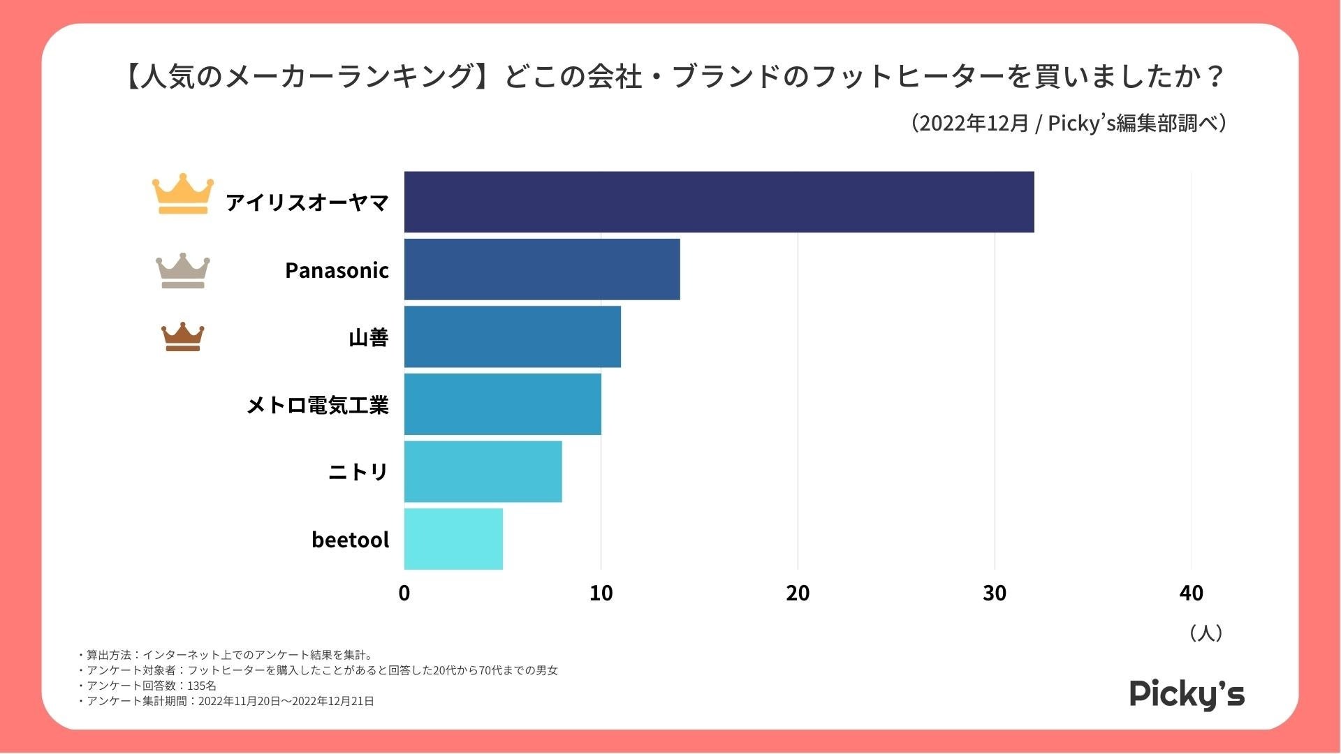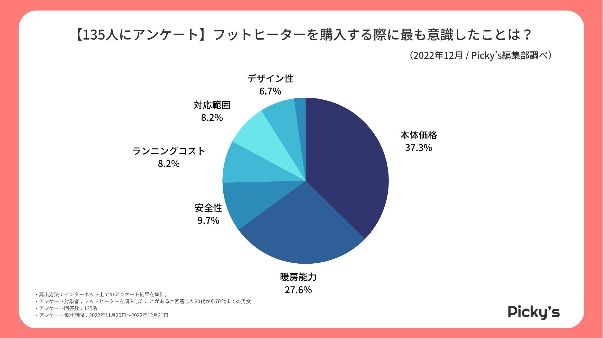 「Picky’s」は、インターネットショッピングにおいて、購入前に試せない・選ぶべきものがわからないという課題の解決を目標に、あらゆる商品のおすすめランキングや検証レビューを紹介するサイトです。このたびPicky’s(https://rentry.jp/note/)では、フットヒーターを買う際に意識していることや人気のメーカー・ブランドなどをインターネット上でアンケート調査を行い、ランキングを作成いたしましたので発表いたします。