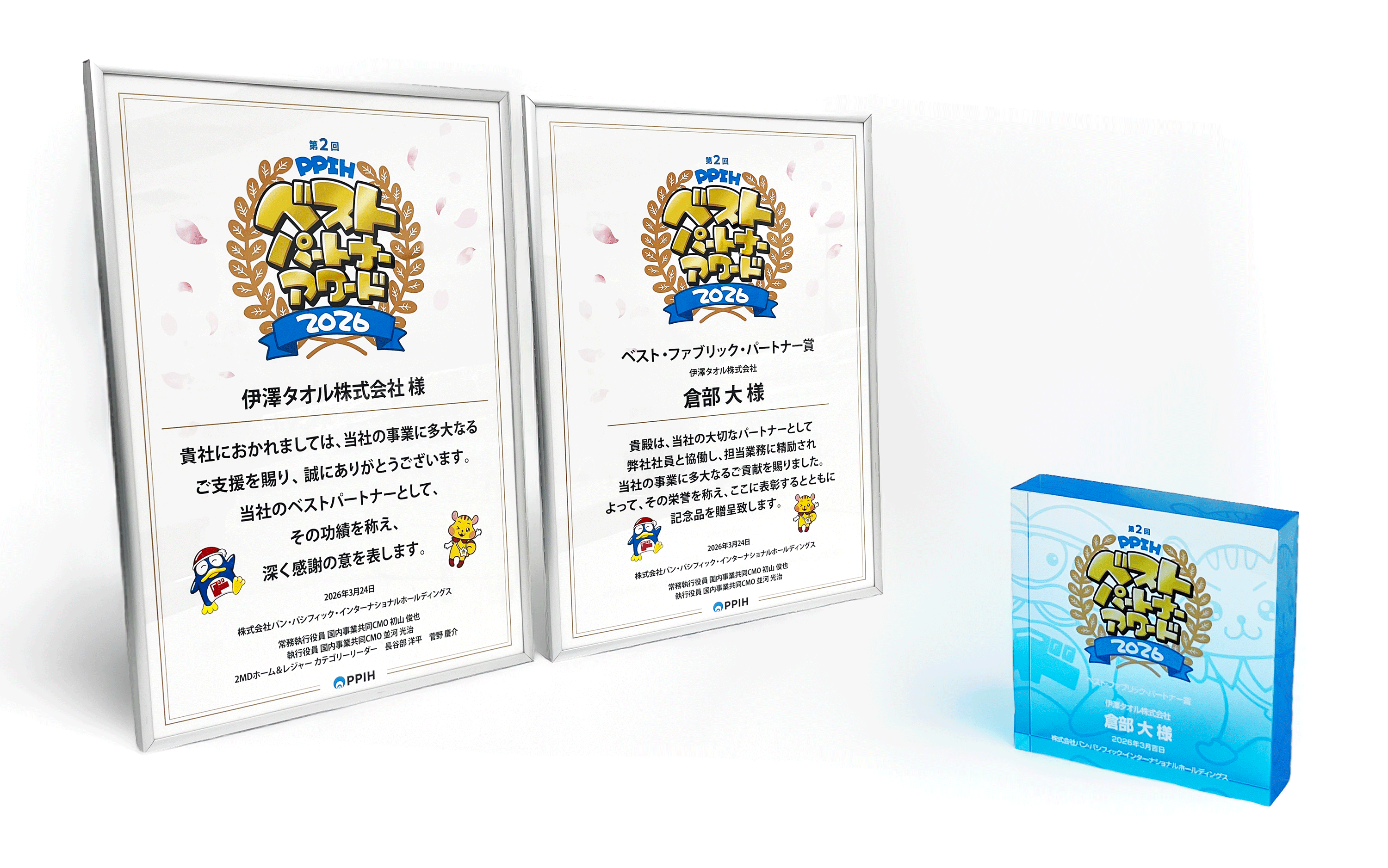 伊澤タオル株式会社(本社:東京都渋谷区、代表取締役社長:伊澤 正司)は、2026年3月24日に株式会社パン・パシフィック・インターナショナルホールディングス(以下、PPIH)が主催する「第2回 PPIHパートナーアワード」において、「ベストパートナーアワード」及び「ベスト・ファブリック・パートナー賞」を受賞いたしましたのでお知らせいたします。