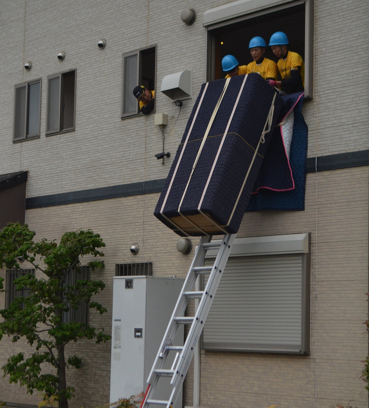 重量のあるタンスを梱包し、安全に窓から吊り下げ・吊り上げができるかを審査。