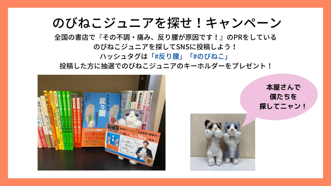 本著の著者・小林篤史が代表を務める株式会社ボディスプラウト(神奈川県川崎市)では『その不調・痛み、反り腰が原因です!』の発刊を記念し「のびねこジュニアを探せ!キャンペーン」を開催します。