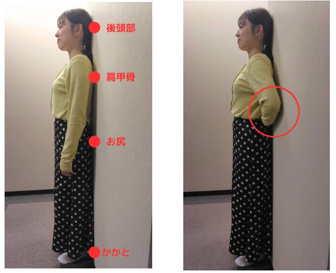 1.つま先を軽く開き、かかと、お尻、肩甲骨、後頭部の4点を壁につけて立ちます。
