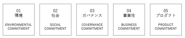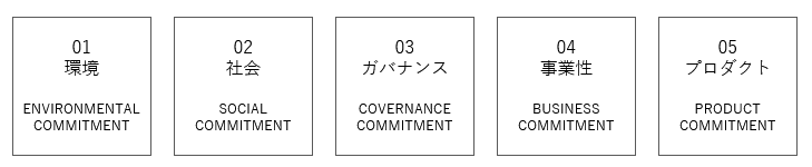 コミットメントは、環境、社会、ガバナンス、事業性、プロダクト、この5つの視点で制定しました。単なる宣言に終わらせず、具体的な取り組みとして、一つ一つの私たちの行動に反映してまいります。