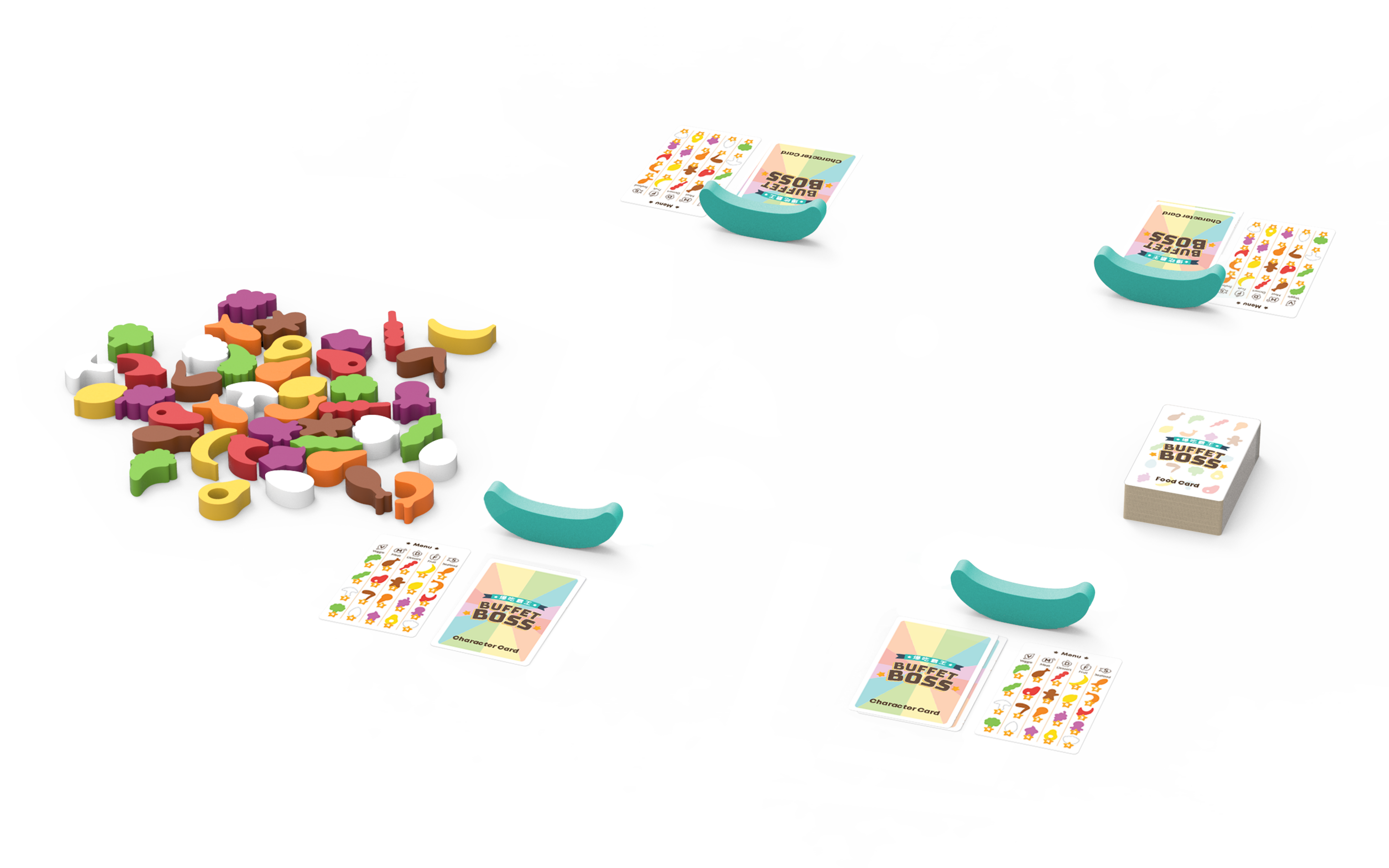 プレイヤーはひとりひとり、自分のお皿に、「ビュッフェコーナー」の食材から好きな食べ物を選び、お皿の上に積んでいき、点数を競います。高得点の食べ物ほど積みにくい形をしているものも・・・。