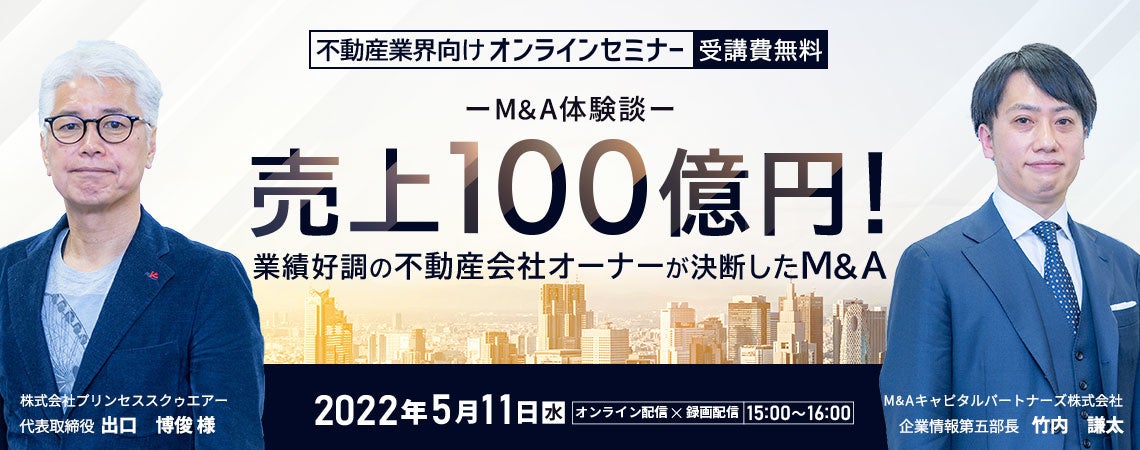 「いつまでも社長業を続けられない」、「個人保証を任せられる後継者がいない」などオーナー経営者にとって、次世代への事業・経営の承継は、最大の経営課題です。今回、不動産業で"グループ売上100億円"と順調な経営を続けてきた、株式会社プリンセススクゥエアーの出口社長をお招きして、事業承継決断「2021年9月、東証プライム上場企業に100%株式譲渡のM&A」の経緯についてお話いただきます。