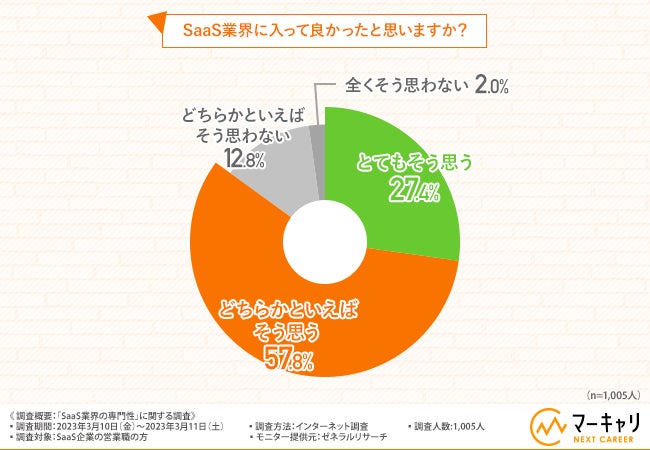 最後に、「SaaS業界に入って良かったと思いますか?」と質問したところ、『どちらかといえばそう思う(57.8%)』 と回答した方が最も多く、次いで『とてもそう思う(27.4%)』『どちらかといえばそう思わない(12.8%)』『全くそう思わない(2.0%)』 と続きました。