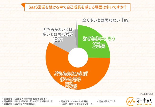 そこで、「SaaS営業を続ける中で自己成長を感じる場面は多いですか?」と質問したところ、『どちらかといえば多いと思う(57.3%)』 と回答した方が最も多く、次いで『とても多いと思う(25.5%)』『どちらかといえば多いとは思わない(15.3%)』『全く多いとは思わない(1.9%)』 と続きました。