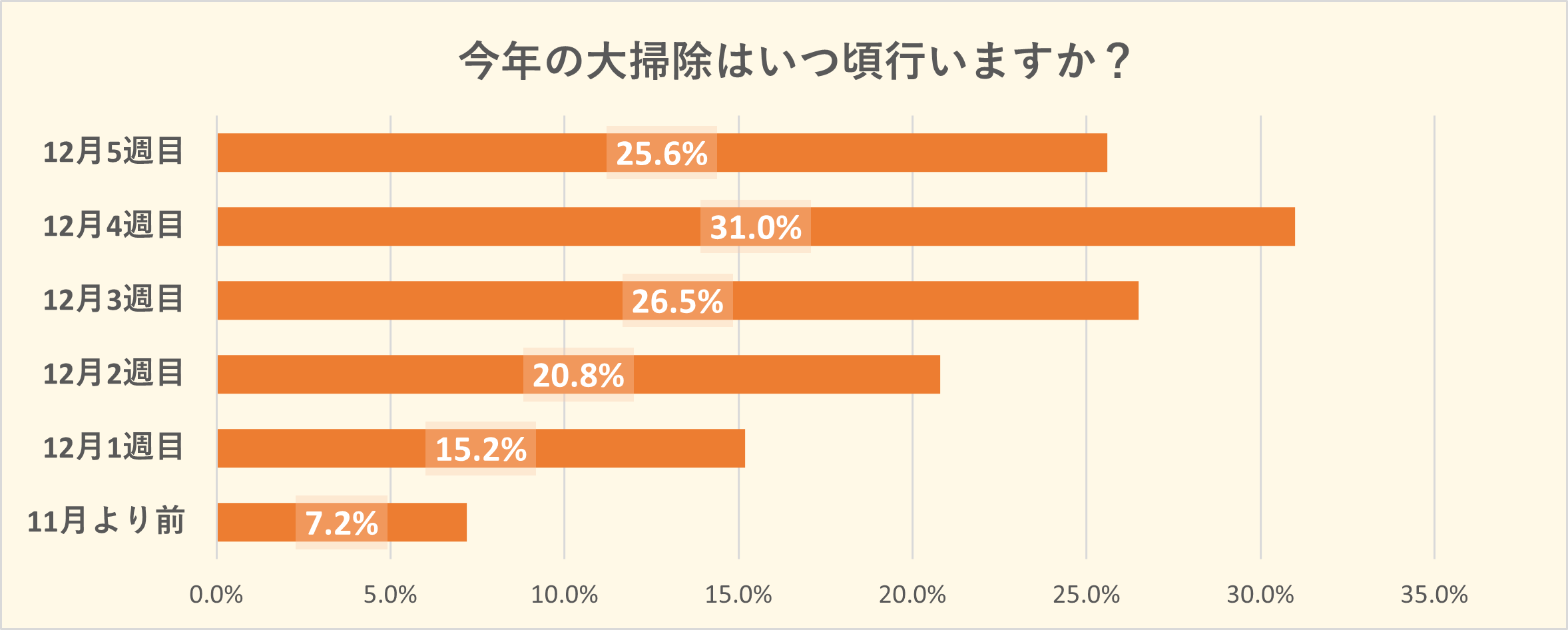 一番多かった回答は31%の方が選んだ「12月4週目」。続いて「12月3週目」26.5%、「12月5週目」25.6%という結果となりました。年末の最終週ではなく、なるべく少し余裕をもって大掃除を片付けたい、という意識も見受けられます。