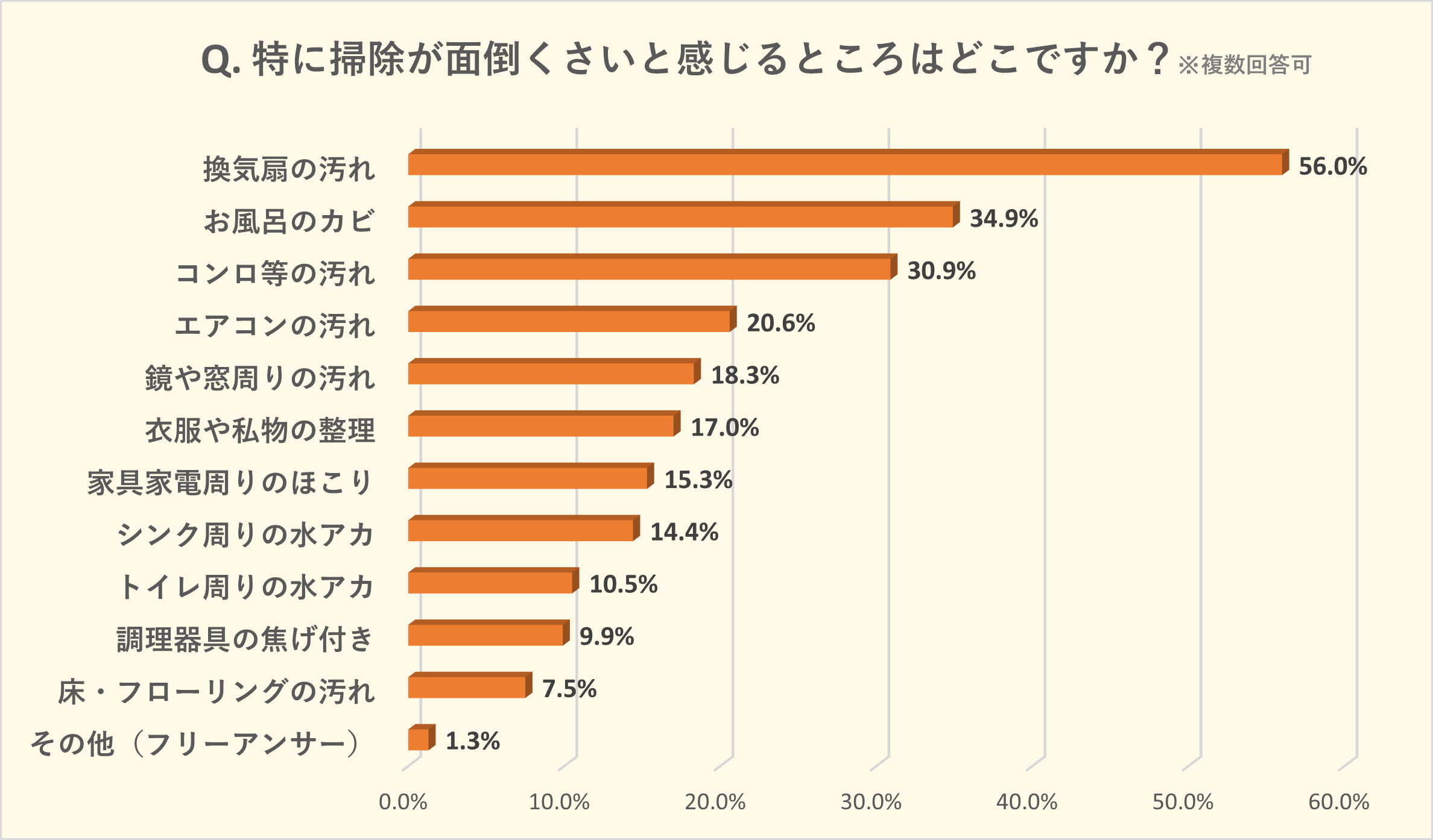 最多の回答は普段の掃除ではなかなか手をつけない「換気扇の汚れ」で56.0%、続いて2位「お風呂のカビ」34.9%、3位「コンロ等の汚れ」30.9%となりました。こちらの設問も回答が分散されており、それだけ大掃除でキレイにしたい場所が多岐にわたりお悩みも多いものと考えられます。