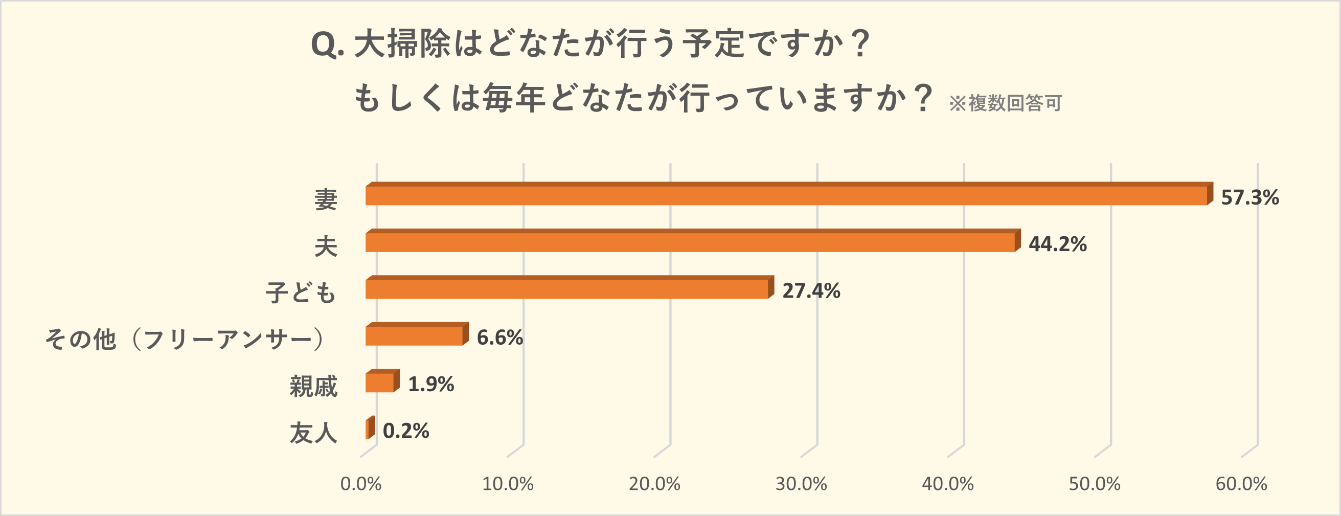 3) ファミリー層(3人以上世帯)で誰が大掃除を行っているか、という質問では最多回答が「妻」の57.3%。およそ13ポイントの差をつけて2位「夫」が44.2%。