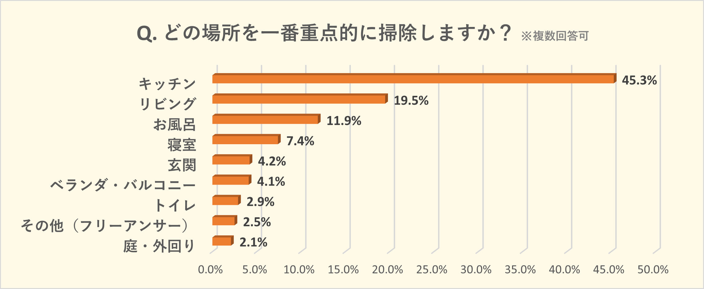 油汚れなど頑固な汚れが多くみられる「キッチン」45.3%が圧倒的な得票で1位となりました。