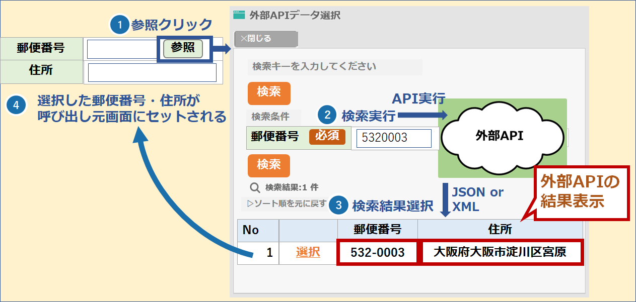 動作例:郵便番号の参照ボタンからポップアップウインドウを開き、外部APIの結果を選択