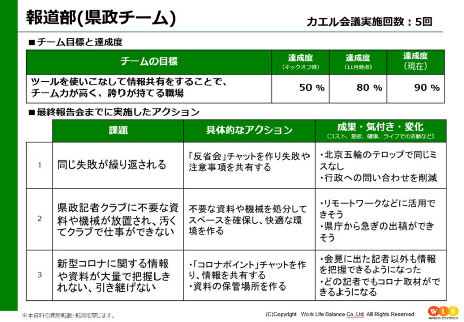 まず、チームごとに目指す理想の働き方を策定し、チームごとに課題を見つけ、解決策を議論する「カエル会議」の実践を進めました。