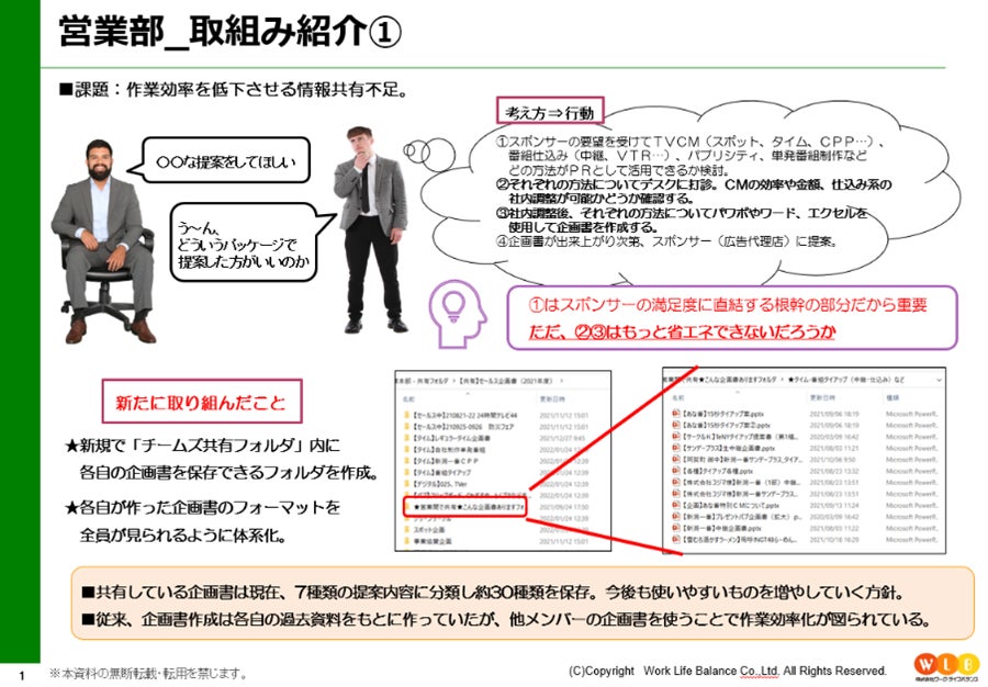 たとえば、制作部では「物が多い・備品がどこにあるか分からない」という課題を解決するべく、「オフィス環境の整備」という取組みを実施しました。さらに番組制作にかける作業時間が長いという課題に向き合い、業務・作業時間の棚卸、情報共有方法の改善、番組コーナーの見直しなど取組みを進めました。また、営業部では、「競合案件で勝つための経験値が部全体で蓄積されていない」という課題を解決するべく、勝ち案件、負け案件の要因を学ぶ営業勉強会という取組みを実施しました。さらに営業スキルの属人化という課題に向き合い、汎用性のある企画書の共有周知という取組みを進めました。