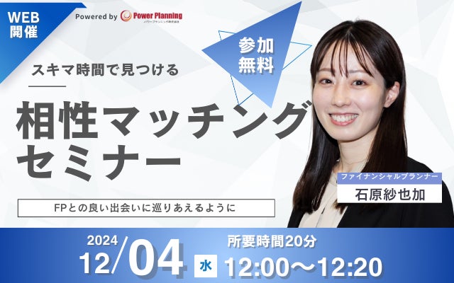 12月4日(水) 12時より、スキマ時間を活用して自分に合ったFPを探すことができる、石原 紗也加講師との「相性マッチングセミナー(無料)」を開催いたします。