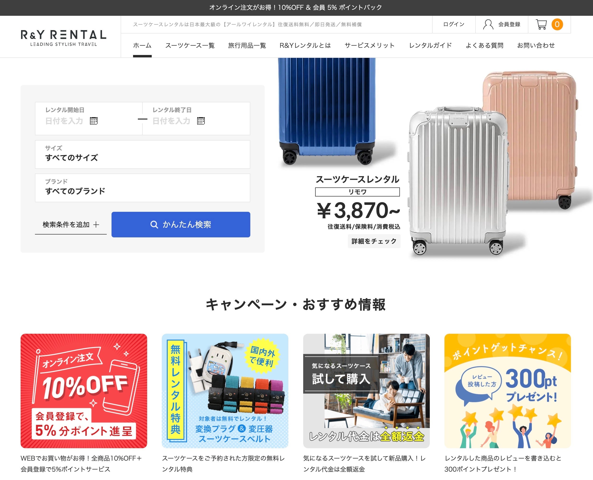 「R&Y RENTAL(アールワイレンタル)」を運営する日本鞄材株式会社は、スーツケースのレンタル・修理・クリーニング・保管・販売事業を行っているスーツケースのトータルサポートカンパニーです。400種類以上もの高級スーツケースなど、常時7,000台以上を在庫する保管庫を保有しています。「『旅』をもっとスマートに。」を理念に、お客様のご旅行がより便利に快適になるようサポートいたします。