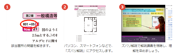 建築基準法大改正にも対応した「分野別厳選問題集」を使用し、問題集の「理解できない」「確認したい」部分をピンポイントでカリスマ講師が「ズバリ解説」いたします!分かりやすく高品質な映像講義で、弱点分野の克服に活用してください。いつでもどこでも、Webで学習!「うちで学ぶ」を実践しましょう。全国統一公開模擬試験(Web実施)付きです。