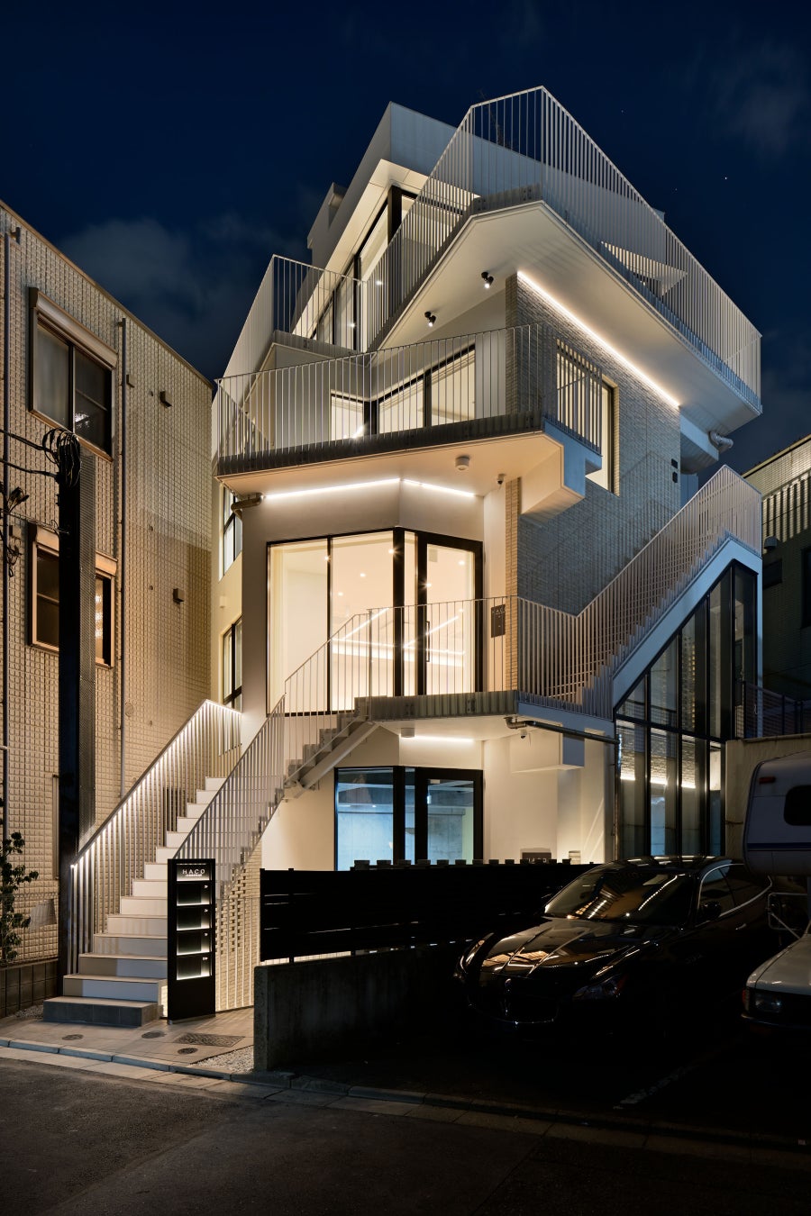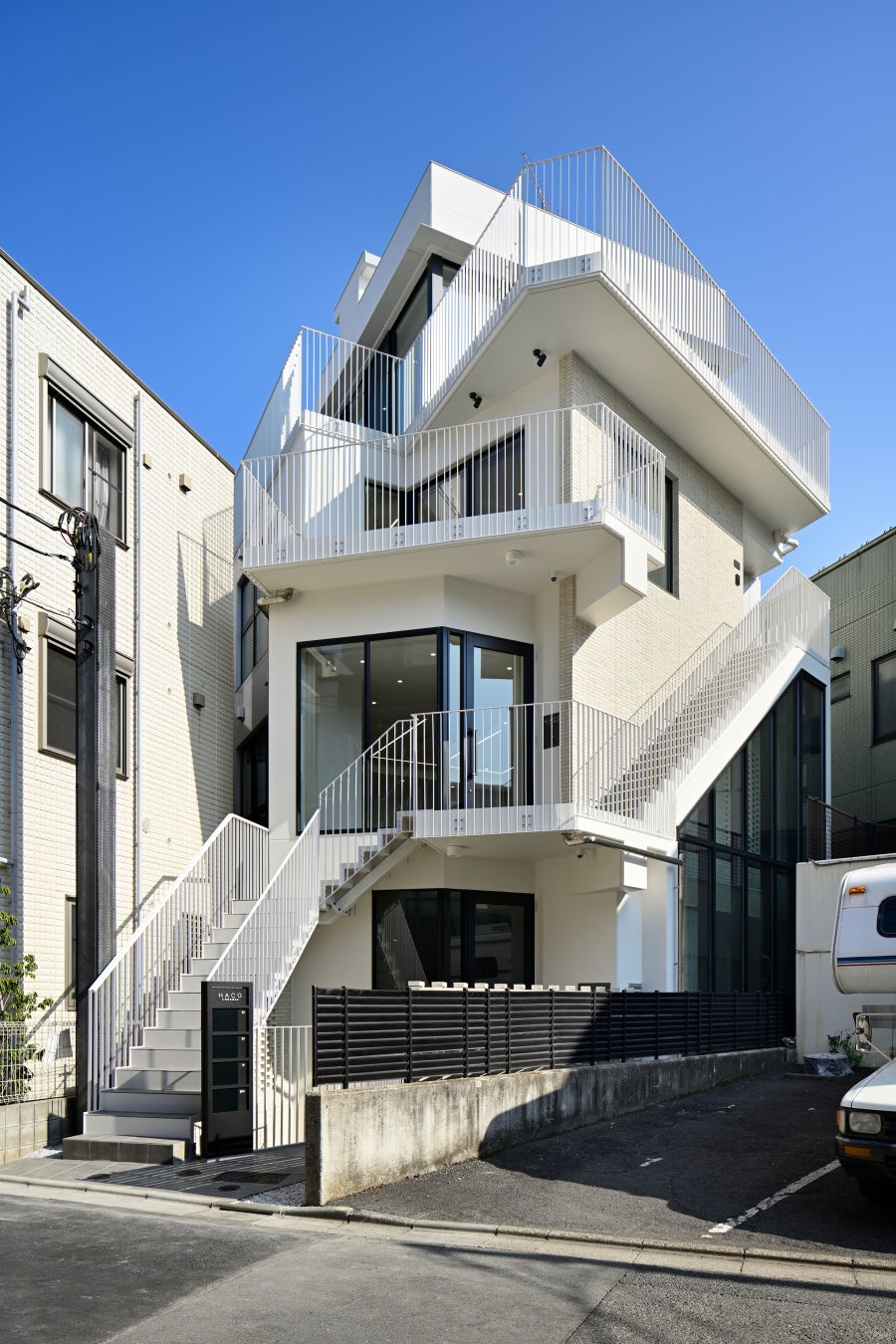 道路からは建物の一部しか見えませんが、各階には多方向に向いたバルコニーを配置し、外観に躍動感と開放感をもたらしています。