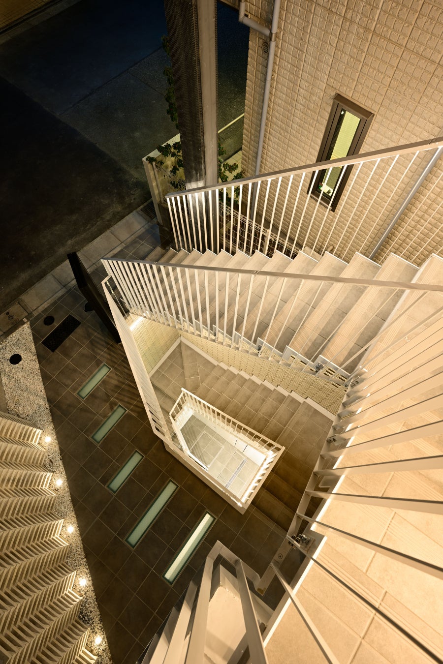 上階へ向かう通路は、建物に巻き付くように配置されており、動線が可視化されることで、建物全体に活気を生み出します。また、地下への通路には中央部に吹き抜けを設け、地上と地下のつながりをより強く感じられる空間とするとともに、採光の確保にも寄与しています。地下から最上階へと螺旋状にのびる通路に沿うことで、上階へ向かうにつれて開放感が高まる設計となっています。