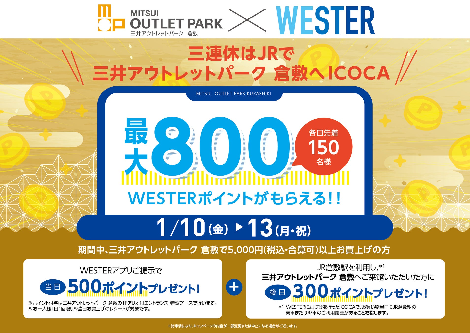 当日、三井アウトレットパーク 倉敷にて5,000円(税込・合算可)以上お買い上げ、かつWESTERアプリご提示で当日WESTERポイント500ポイントをプレゼントいたします。さらに、当日鉄道利用(JR倉敷駅)し、来館いただいた方にはWESTERポイント300ポイントを後日プレゼントいたします。