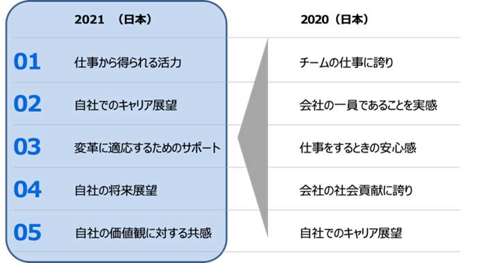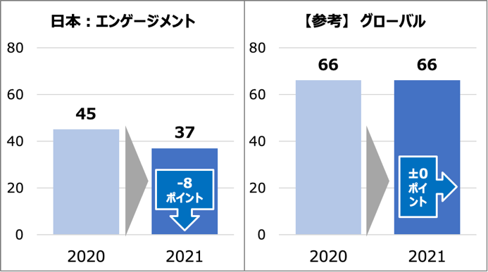 さらに、日本のスコアは、前回調査から8ポイント低下しました。世界全体やAPJ地域全体が横ばいないし若干上昇したことからすると、日本の低下は特徴的な変化といえます。2020年にはエンゲージメントが上昇していたことを踏まえると、コロナ禍初期に取られた会社・組織による各種アクションが一巡し、2021年はその反動で低下、さらに2022年にどのように変化するのか、注視すべきであると考えられます。