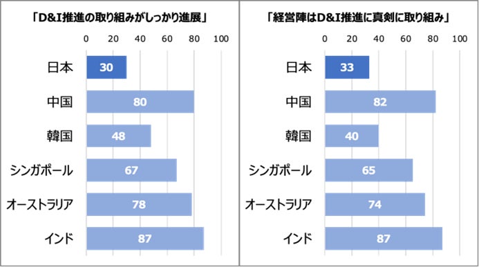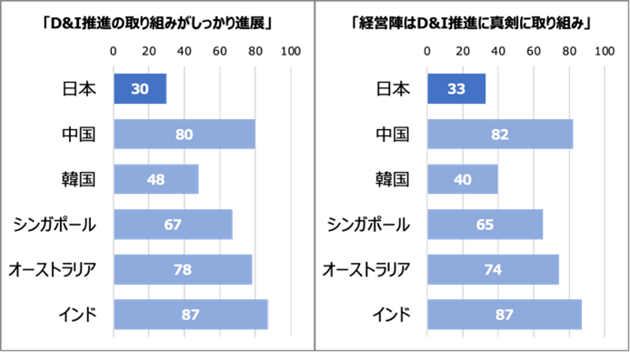 日本では「D&I推進」の掛け声は聞こえてきますが、アジア大洋州の主要国と比べても、従業員からみた進展度合いは不十分で、経営陣の取り組み姿勢も弱いといえます。革新的な商品・サービスを生み出す上でD&Iが不可欠であることはもちろん、能力のある従業員を定着させる上で多様な人材の受け入れは重要な課題になると考えられます。