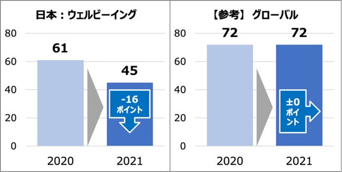 しかし、今回の日本の調査結果をみると、ウェルビーイングは大幅に低下しています。一般に、職場におけるウェルビーイングは、個人の立場の尊重、組織への帰属意識、担当業務に対するやりがいなどによって影響を受けると考えられます。こうした要素を大事にしながら、従業員が心身ともに健康で、信頼関係を築きながら、イキイキと働ける職場の実現が望まれます。