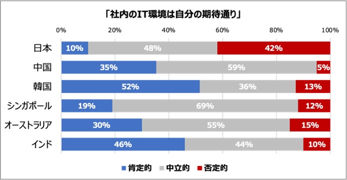 リモートワークにおいては、IT環境の不十分さが社内コミュニケーションや情報収集、事務処理の阻害要因にならないことが大前提であると当初から指摘されてきました。しかしながら、日本では、自社のIT環境が期待通りと捉えている従業員はわずか10%に過ぎず、極めて少数派です。アジア主要国との比較においても、日本のIT環境が大きく遅れている可能性があることには十分留意すべきといえます。