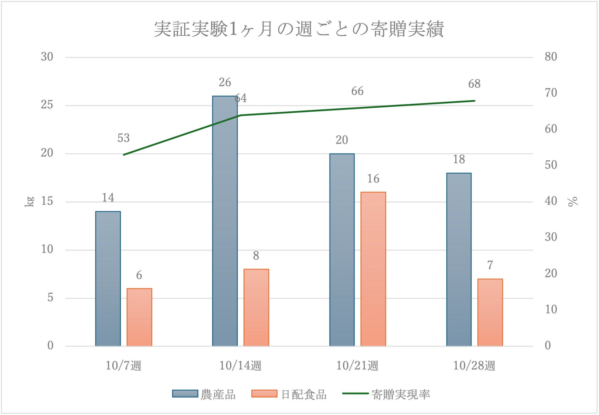 実証実験開始から1ヶ月で、農産品(野菜・果物)約78kg(402点)、日配食品約37kg(169点)の合計約115kg(571点)の食品を寄贈しました。寄贈対象となった商品の1ヶ月平均の寄贈実現率は約63%であり、実証実験開始時点より向上しています。